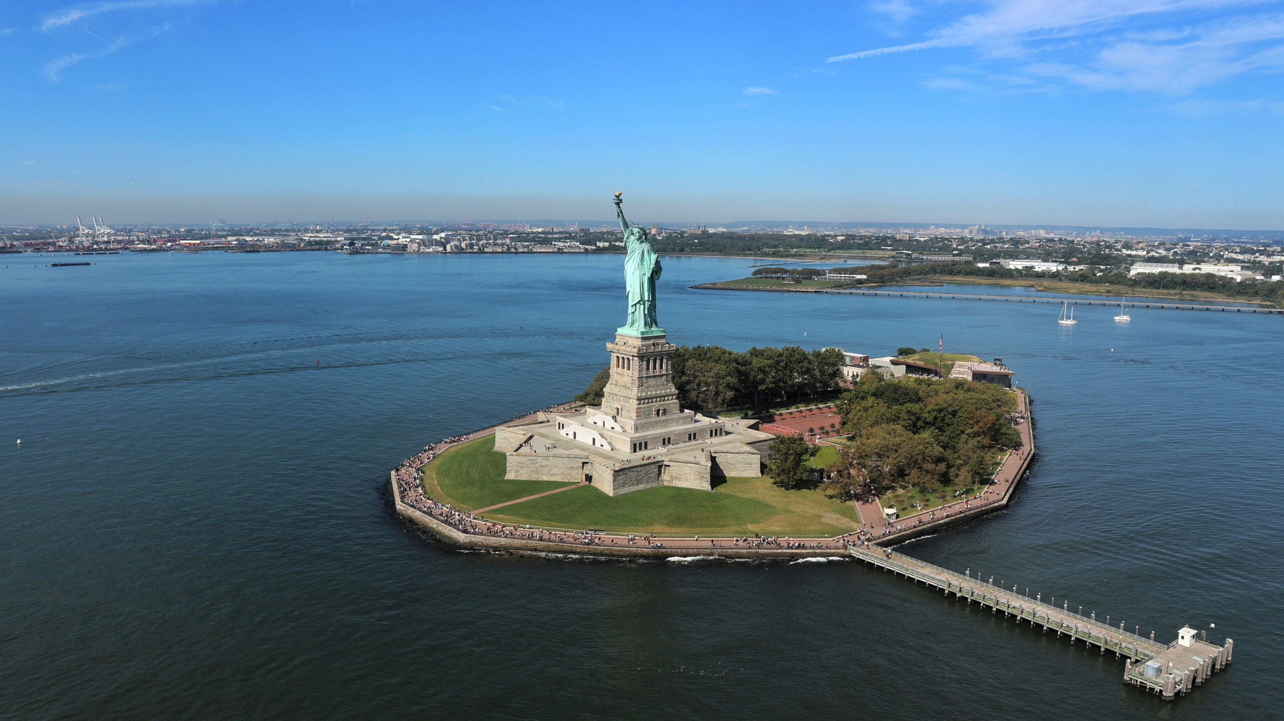 Liberty,Island,Surrounded,By,Hudson,River.,A,Clear,Blue,Sky